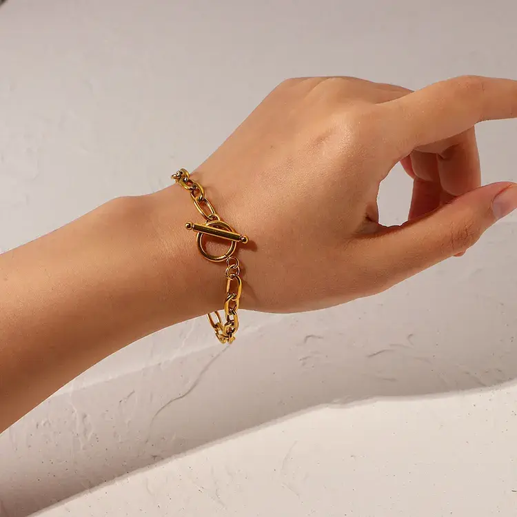 This RomanBracelet is a designer piece of jewellery that is sure to turn heads. Crafted from 18k gold plated links and featuring a modern, trendy design, this piece is perfect for those looking to make a statement. It's sure to be the perfect accessory for any outfit.